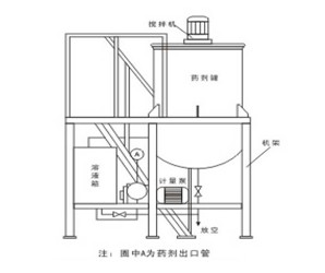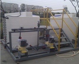 加藥裝置由溶液罐、若干法蘭、閥門等組成。配置兩臺計量泵,一用一備,這樣方便用戶在不停機狀態下進行檢修、更換配件。