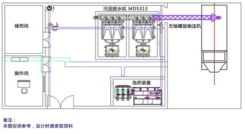 3) 無軸螺旋輸送機或進料斗的高度設置可參考泥餅排出口底端離地面的高度。