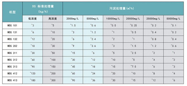 2) 絕干污泥(DS)是指理論上不含水分的污泥,泥水混合物的處理量=絕干污泥處理量÷污泥濃度。在污泥的性質、濃度不明確的情況下進行選型時,建議采用絕干污泥處理量平均值來計算。計算例:當泥水混合物的濃度為2%時,MDS312的泥水混合物處理量=100kg/h÷2%=5m3/h
